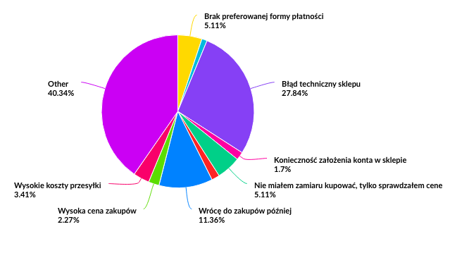 Okazało się jednak, że poza powodem “inne”, większość zakupów nie dochodzi do skutku ze względu na problemy techniczne i brak preferowanego sposobu płatności.